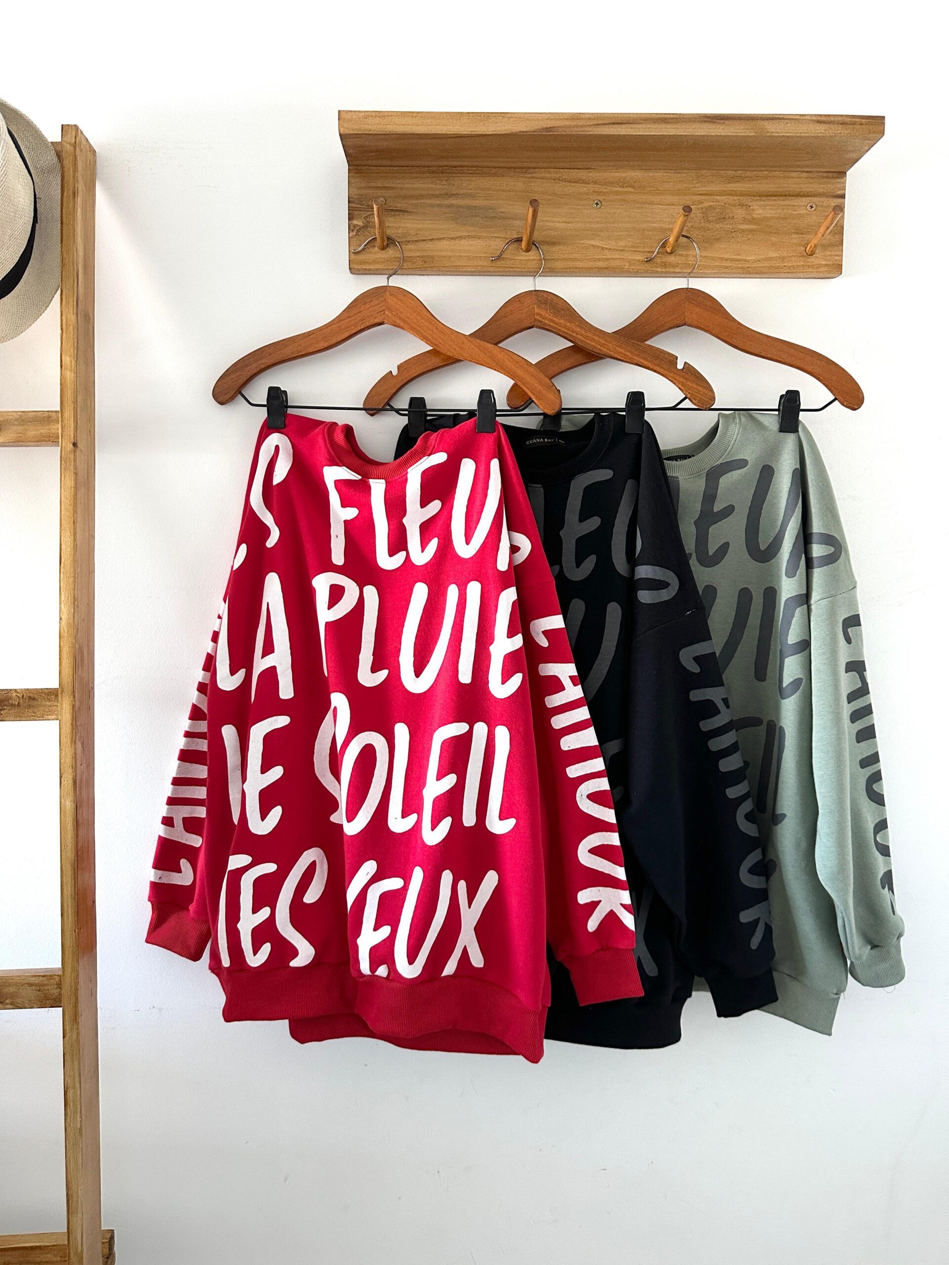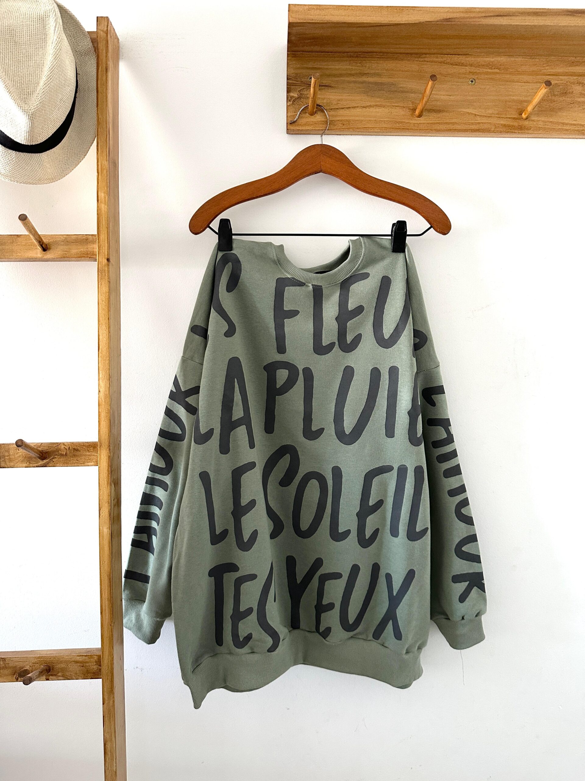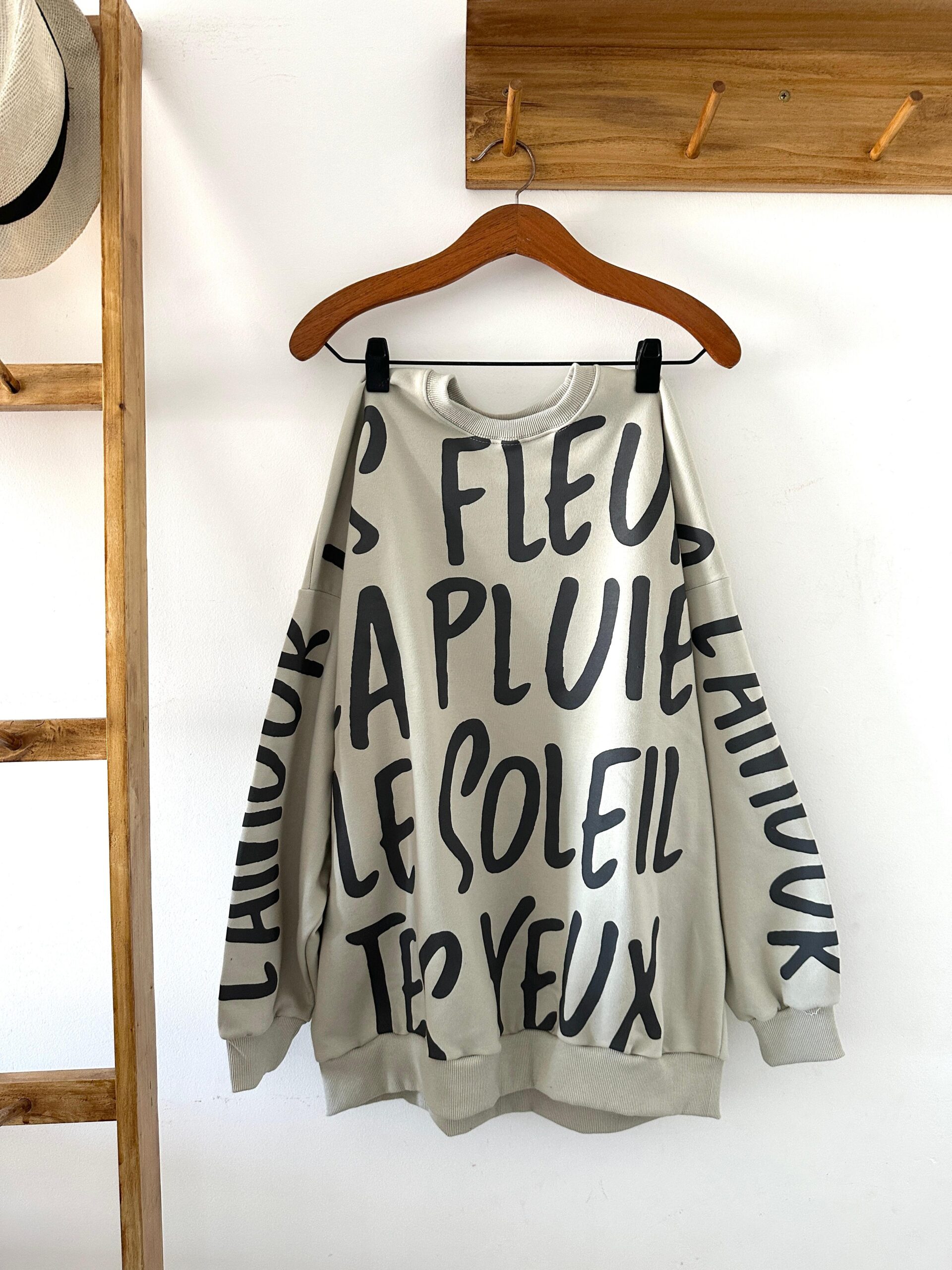 Buzo de algodón rústico corte amplio y con una estampa full con palabras francesas. Super copado y muy bello!