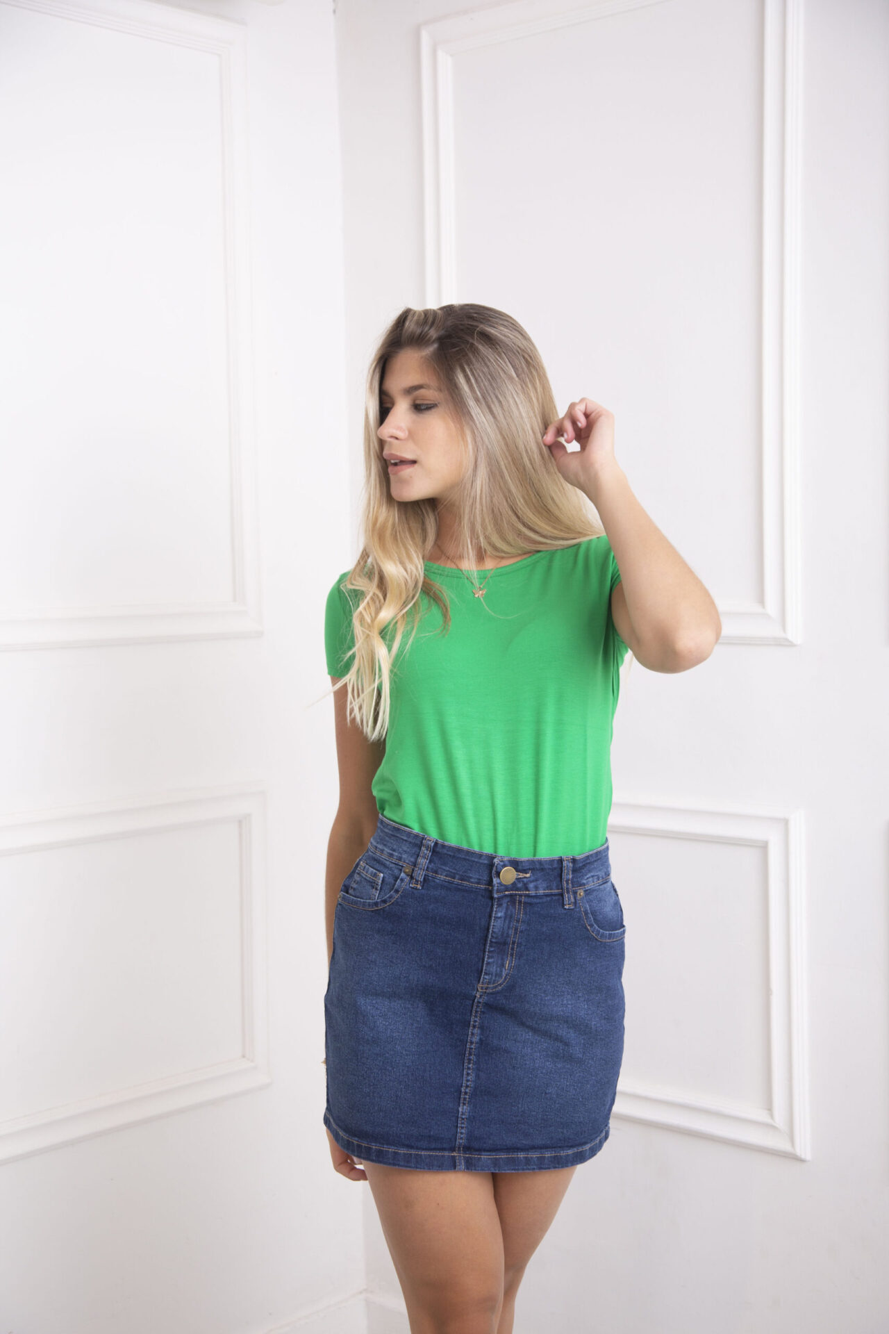 Falda de jean de genero importado, Elastizada y a media pierna. en lavado azul gastado
